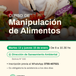 Desde el Gobierno de la Ciudad de Oberá, invitan a la comunidad en general, a participar del taller de Manipulación Segura de alimentos que se brindará el martes 13 y jueves 15 de enero en el horario de 8 a 10:30 horas en la Dirección de Saneamiento Ambiental, sobre calle…
