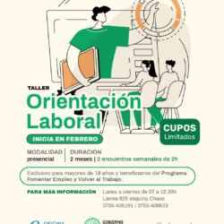 El Gobierno de la Ciudad de Oberá, a través de la Oficina de empleo invitan al Taller de Orientación Laboral que se dictará el mes de febrero y es exclusivo para mayores de 18 años y beneficiarios del Programa Fomentar empleo y VAT (Volver al Trabajo).