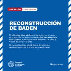 El Gobierno de la Ciudad de Oberá informa que este miércoles 1 de abril se llevarán a cabo trabajos de bacheo sobre calle Río Negro, por lo que el tránsito permanecerá cortado desde las 17 horas hasta la madrugada.