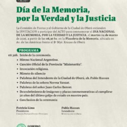 La Comisión Festejos Cívicos y Populares, junto al Gobierno de la Ciudad de Oberá extienden la invitación a la comunidad a participar del acto conmemorativo por el Día Nacional de la Memoria, por la Verdad y la Justicia, que se llevará a cabo el martes 24 de marzo de 2026,…