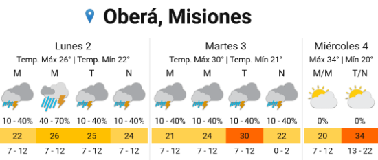 Temperaturas: máxima en la provincia estimada en 34°C para Aristóbulo del Valle, con 34°C de sensación térmica, la mínima sería de 17°C en Iguazú.