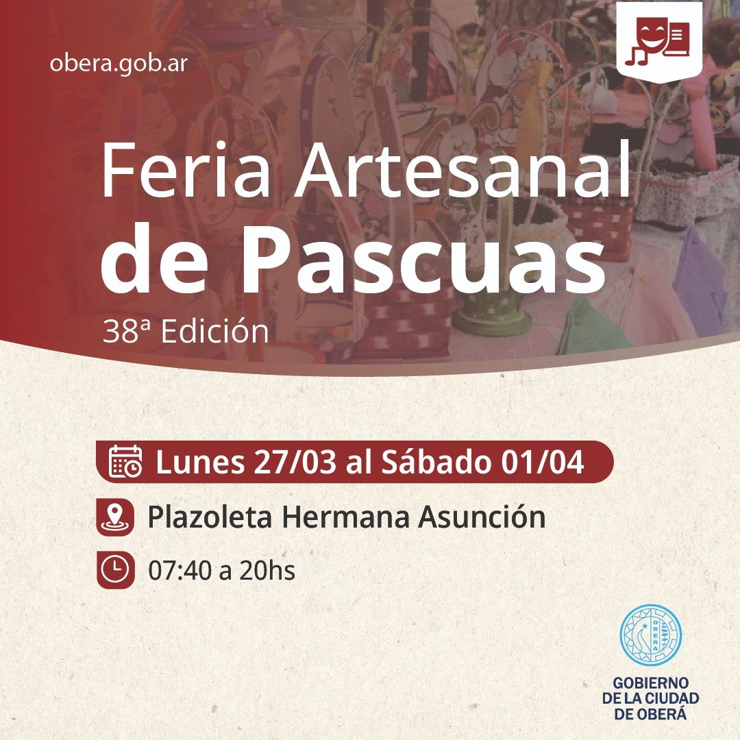 Desde el lunes 27 de marzo hasta el sábado 1 de abril, los artesanos obereños estarán exhibiendo y ofreciendo sus productos artesanales con diversas opciones para Semana Santa.