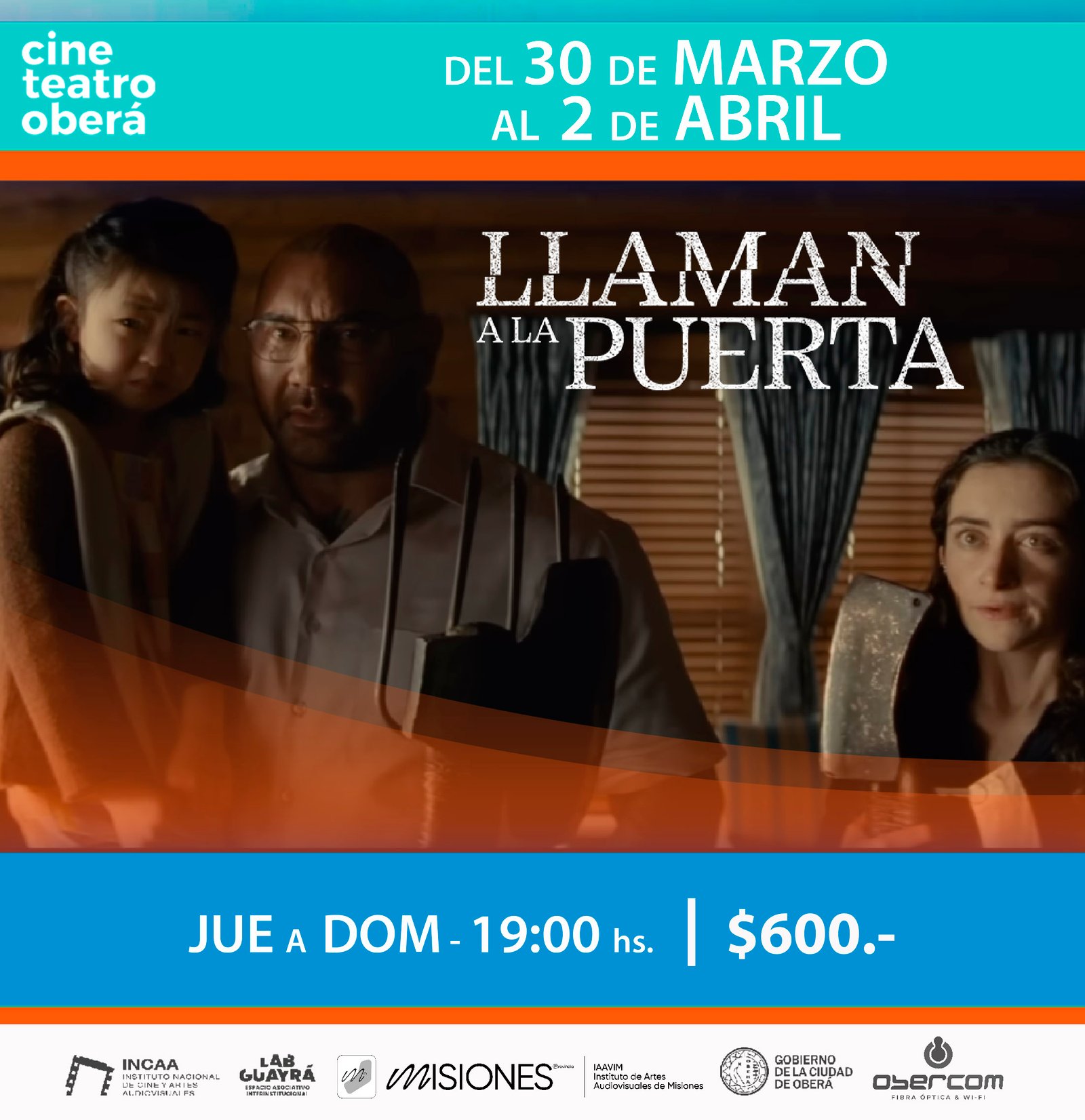 Sinopsis: Durante unas vacaciones en una cabaña en un bosque alejada de todo, una niña y sus padres se convierten en rehenes de cuatro desconocidos armados que obligan a la familia a tomar una decisión imposible para evitar el apocalipsis. Con acceso limitado al mundo exterior, la familia deberá decidir qué creer antes de que todo esté perdido.