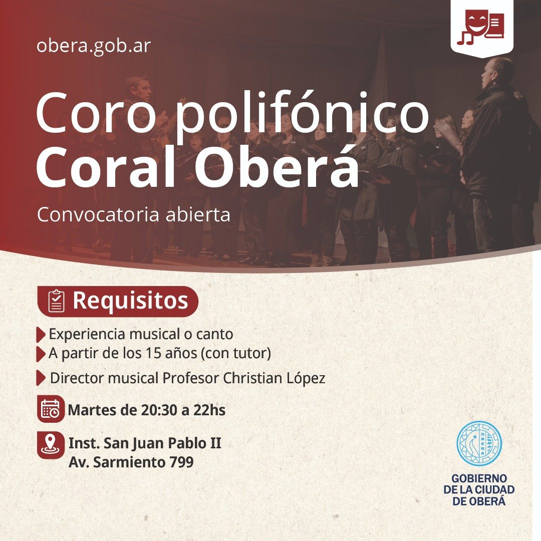 Se encuentra abierta la convocatoria para ser parte del Coro Municipal “Coral Oberá”. Las clases se llevarán a cabo todos los martes de 20:30 a 22hs, en el Instituto San Juan Pablo II, ubicado en Av. Sarmiento 799, las mismas serán dictadas por el Prof. Christian López.