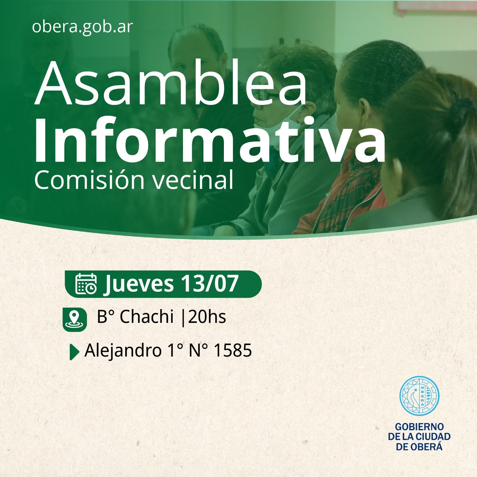 Desde el Gobierno de la Ciudad de Oberá, se convoca a los vecinos del Barrio Chachi a la realización de una asamblea informativa el jueves 13 de julio, vinculada a todo lo que involucra al proceso de elecciones para la renovación de autoridades de las Comisiones Vecinales.