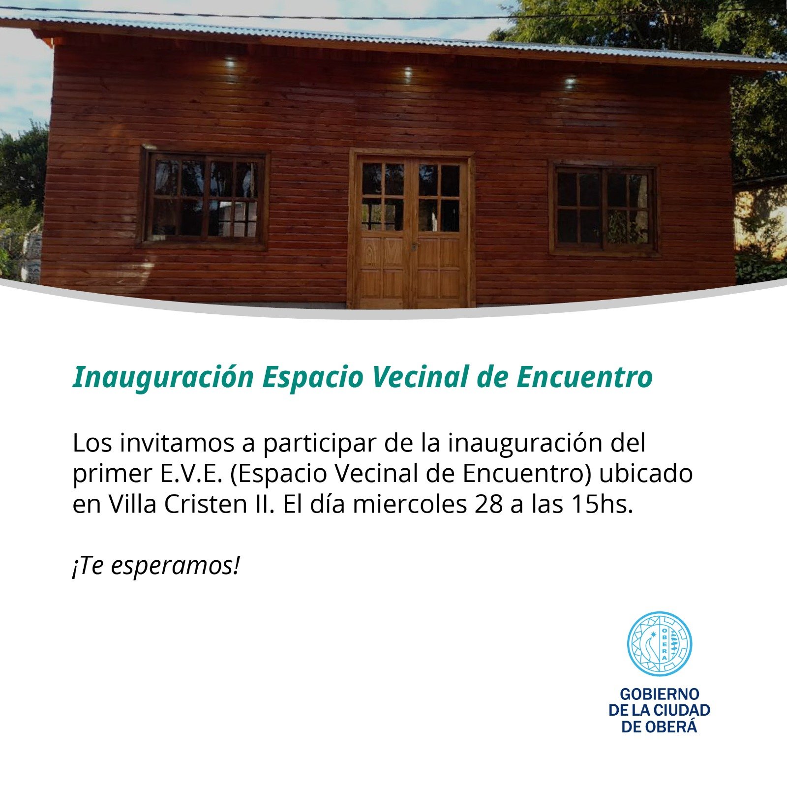 El Gobierno de la Ciudad de Oberá invita a participar de la inauguración del nuevo Espacio Vecinal de Encuentro (EVE) ubicado en Villa Cristen, el día miércoles 28 de junio a las 15hs.