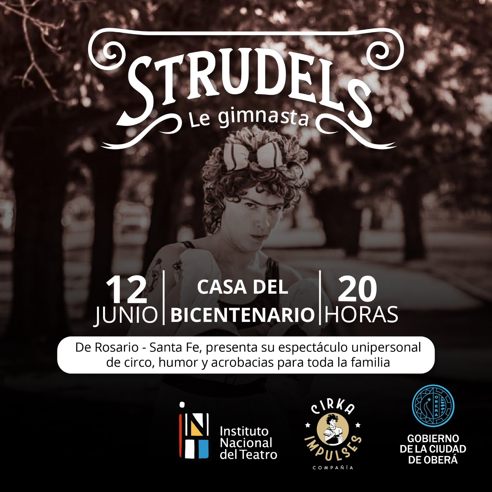Esta obra teatral «Strudels, Le Gimnasta», es llegada de Rosario (Santa Fe), es un espectáculo unipersonal de circo, con contenido humorístico y cargado de acrobacias, destinados a toda la familia. Al finalizar la presentación, se realizará un conversatorio sobre el desmontaje y contenido de la misma.