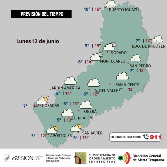 Temperaturas: máxima en la provincia estimada en 15 °C para Posadas; la mínima sería de 4 °C en Apóstoles con 2 °C de sensación térmica.
