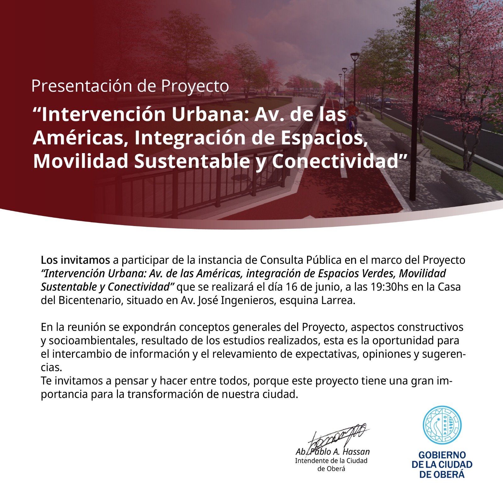 El próximo viernes 16 de junio a partir de las 19.30hs, en el salón auditórium de la Casa del Bicentenario, se llevará adelante la consulta pública y presentación del proyecto “Intervención Urbana: Av. de las Américas, Integración de Espacios Verdes, Movilidad Sustentable y Conectividad”, en donde se expondrán los conceptos generales, aspectos constructivos y socio-ambientales, resultado de los estudios realizados.