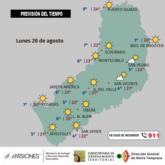 Temperaturas: máxima en la provincia estimada en 24 °C para Posadas; la mínima sería de 4 °C en San Vicente con 2 °C de sensación térmica.