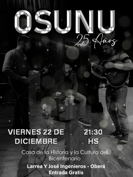 El grupo Osunu Folklore, uno de los referentes de la música folclórica de la región, festejará sus 25 años de trayectoria con un show gratuito este viernes 22 de diciembre, a las 21.30 hs, en la Casa del Bicentenario de Oberá.