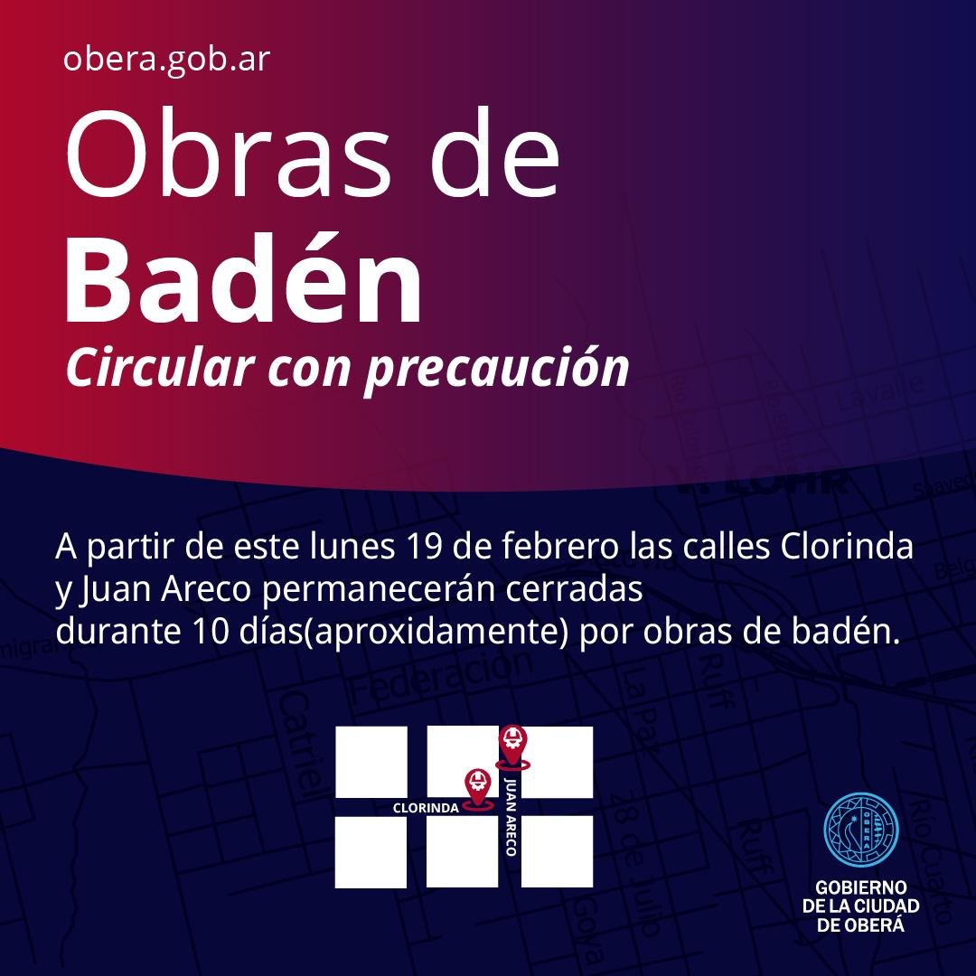 Desde el Gobierno de la Ciudad de Oberá se solicita circular con precaución por las calles Clorinda y Juan Areco, ya que estas permanecerán cerradas a partir de la fecha por aproximadamente 10 días.