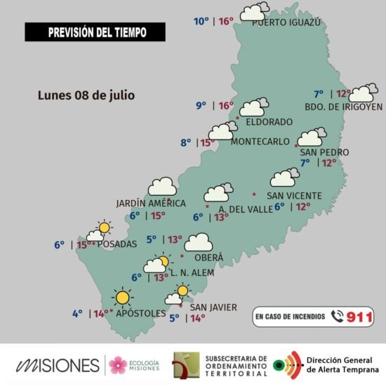 Temperaturas: máxima en la provincia estimada en 13 °C para Eldorado; la mínima sería de 3 °C en Apóstoles con sensación térmica de 1 °C.