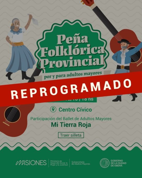 Por las inclemencias del tiempo, se reprograma la Peña Folclórica Provincial para el próximo mes de noviembre. La actividad está previsto que se desarrolle en el centro cívico de Oberá.