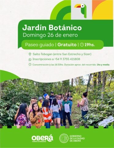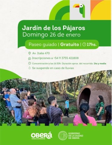 Este domingo 26 de enero, la Dirección de Turismo, Recreación y Cultura de Oberá invita a la comunidad y a los turistas a participar de dos paseos guiados por los atractivos naturales más destacados de la ciudad. La propuesta incluye visitas al Centro de Interpretación Ambiental “Jardín de los Pájaros” y al Jardín Botánico, con un enfoque educativo y recreativo para toda la familia.