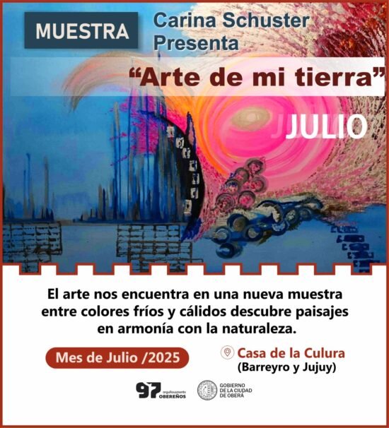 Durante el mes de julio, la Casa de la Cultura de la ciudad de Oberá alberga la muestra de la artista plástica Carina Schuster, quien realiza su primera presentación en el Salón «Hugo Amable». La exposición lleva por título “Arte de mi tierra” y ofrece una colección de paisajes realizados con técnica de pintura acrílica sobre bastidor y madera.