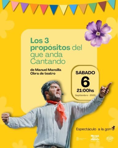 El sábado 6 de septiembre, desde las 21:00, se presentará “Los tres propósitos del que anda cantando”, un espectáculo a cargo de Manuel Mansilla, quien encarnará a un viajero cargado de canciones, relatos y memorias de los pueblos. A través de su voz, el artista llevará al público por escenarios que evocan la inmigración, los movimientos sociales y los orígenes culturales, utilizando la música como puente para transmitir historias colectivas y emociones compartidas.