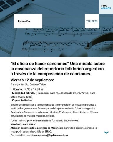 El próximo viernes 12 de septiembre, de 14:30 a 17:30, se realizará el taller “El oficio de hacer canciones. Una mirada sobre la enseñanza del repertorio folklórico argentino a través de la composición de canciones”, a cargo del Lic. Octavio Taján.