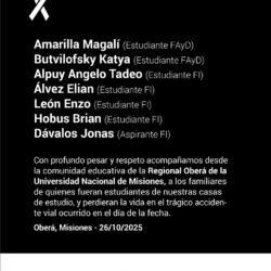 El micro en el que viajaban colisionó con un Ford Focus en la madrugada de este domingo. La Universidad Nacional de Misiones, con profundo pesar, dispuso 5 días de duelo y 2 de asueto académico y administrativo en su sede regional.