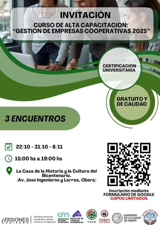 El Gobierno de la Ciudad de Oberá invita a participar de la Capacitación en Gestión Cooperativa, una propuesta gratuita, de calidad y con certificación universitaria, orientada a fortalecer las herramientas de administración y liderazgo en el ámbito cooperativo.
