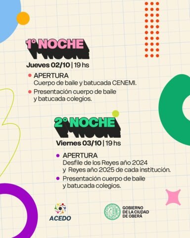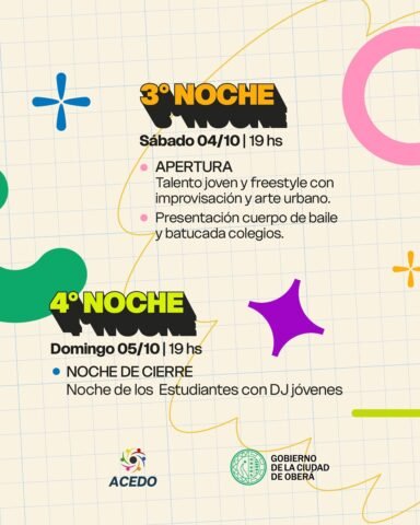 Cada jornada comenzará a las 19 horas y se espera la presencia de miles de obereños y visitantes que se acercarán para acompañar a los jóvenes protagonistas. El cierre del domingo contará con un show especial, marcando el broche de oro de cuatro noches cargadas de música, color y alegría.