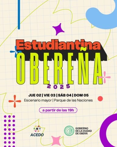 La ciudad de Oberá ya palpita la Estudiantina 2025, que se desarrollará del jueves 2 al domingo 5 de octubre en el Escenario Mayor del Parque de las Naciones. La fiesta, organizada por la Asociación de Centros de Estudiantes de Oberá (ACEDO) con el acompañamiento del Gobierno de la Ciudad, fue declarada de Interés Público, Educativo y Municipal por el Concejo Deliberante.