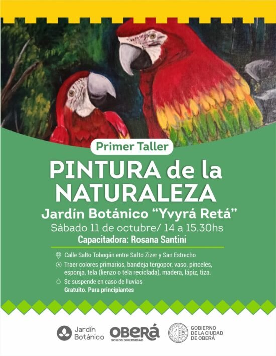 El Gobierno de la Ciudad de Oberá, a través de la Dirección de Turismo, Recreación y Cultura, invita a vecinos y turistas a participar de una iniciativa que fusiona la expresión artística con la educación ambiental. Se trata del Primer Taller «PINTURA de la NATURALEZA» , una actividad gratuita diseñada para reforzar la conciencia sobre el cuidado de nuestra flora y fauna a través del arte. La actividad es ideal para disfrutar en familia o con amistades, sirviendo además como un atractivo más para turistas que eligen Oberá como espacio de esparcimiento.