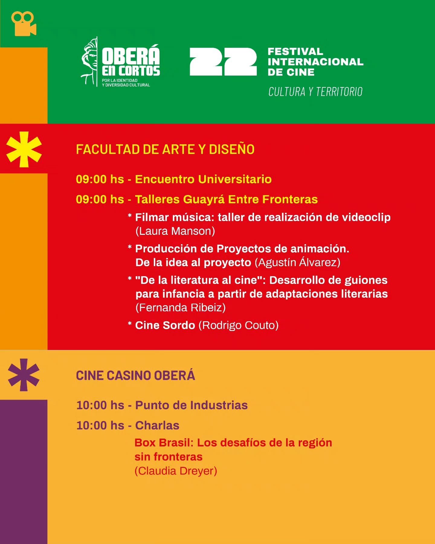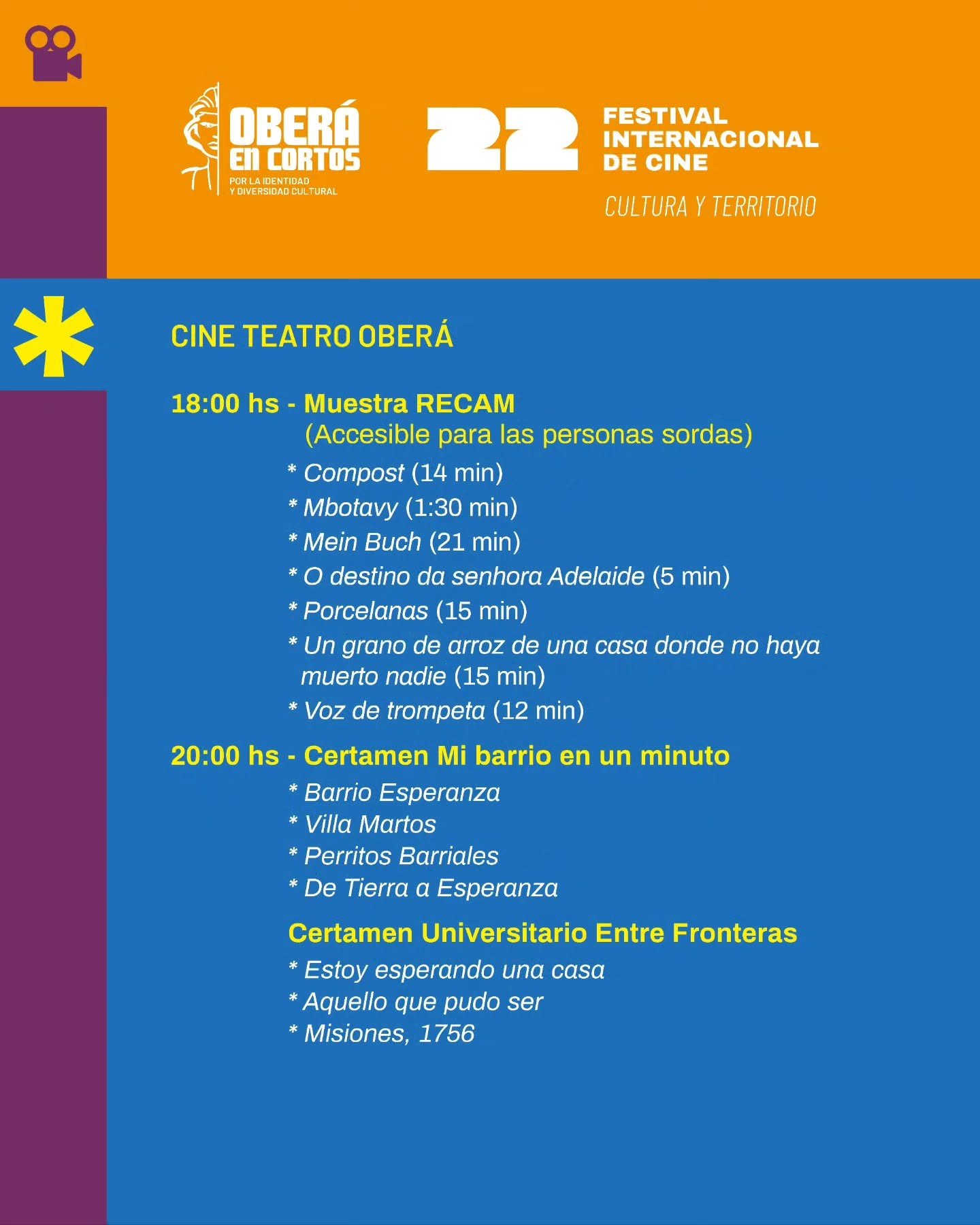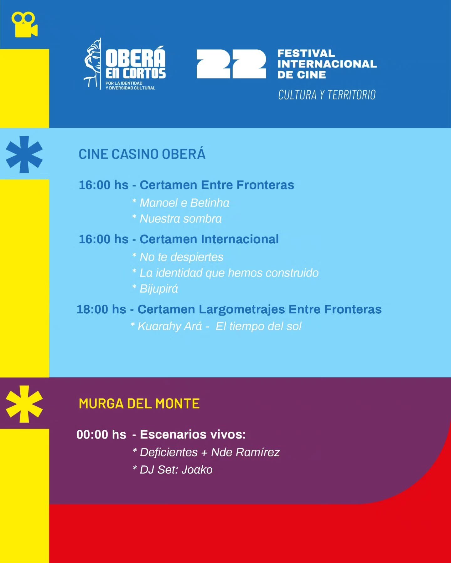 Organizado por el Instituto de Artes Audiovisuales de Misiones, la Municipalidad de Oberá y la Universidad Nacional de Misiones (UNaM) —a través de la Facultad de Arte y Diseño (FAyD) y la Facultad de Humanidades y Ciencias Sociales (FHyCS)—, el festival llega a su 22ª edición reafirmando su compromiso con la integración cultural y la producción audiovisual con identidad regional.