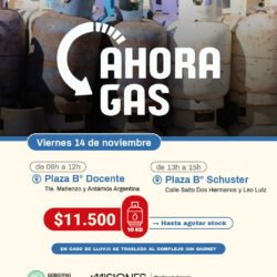 Mañana viernes 14 de noviembre, el programa “Ahora Gas” estará presente en distintos barrios de Oberá, ofreciendo garrafas de 10 kilos a un precio accesible de $11.500, hasta agotar stock.