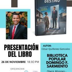 El próximo 26 de noviembre, a las 18:30, se realizará la presentación del libro “El niño que cambió su destino”, obra del autor César Quiñónez Gonzalez, en la Biblioteca Popular Domingo F. Sarmiento de la ciudad de Oberá, Misiones.