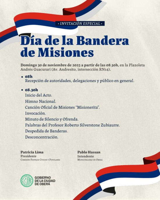El Gobierno de la Ciudad de Oberá, junto a la Comisión de Festejos Cívicos y Populares, invita a la comunidad en general a participar del acto oficial por el Día de la Bandera de Misiones, que se llevará a cabo el domingo 30 de noviembre de 2025, a partir de las 08.30 horas, en la Plazoleta Andrés Guacurarí (Av. Andresito, intersección con RN14).