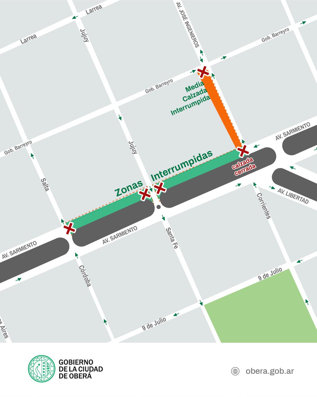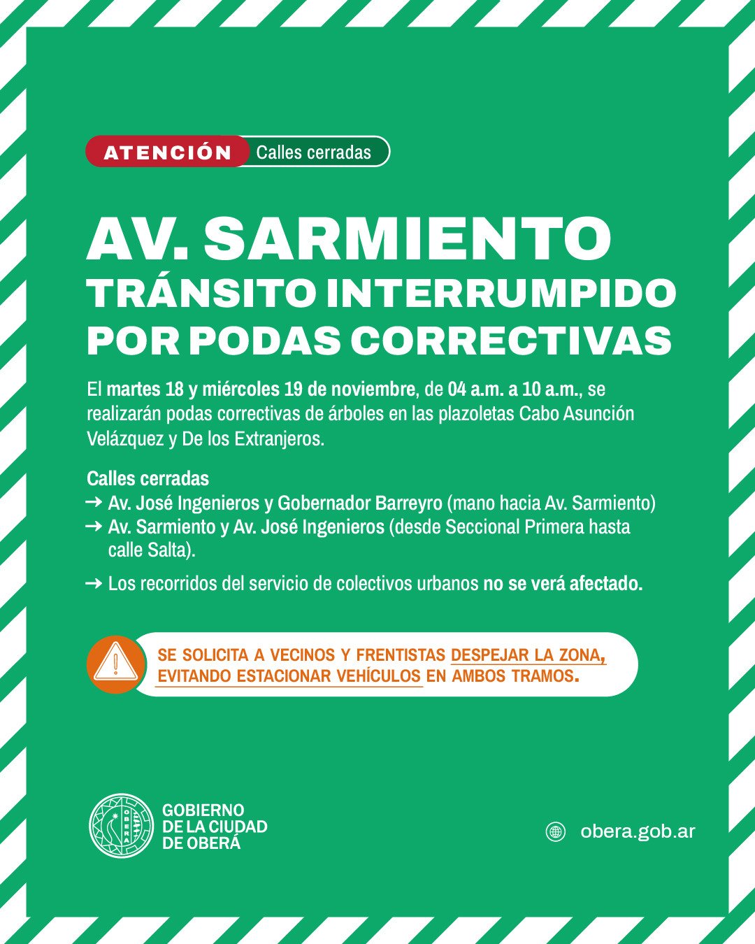 La Municipalidad de Oberá anunció un corte programado de tránsito para el comienzo de esta semana que afectará a una de las arterias principales de la ciudad. Según se comunicó oficialmente, se realizarán podas correctivas en el arbolado urbano, específicamente en el sector de las plazoletas Cabo Asunción Velázquez y De los Extranjeros.