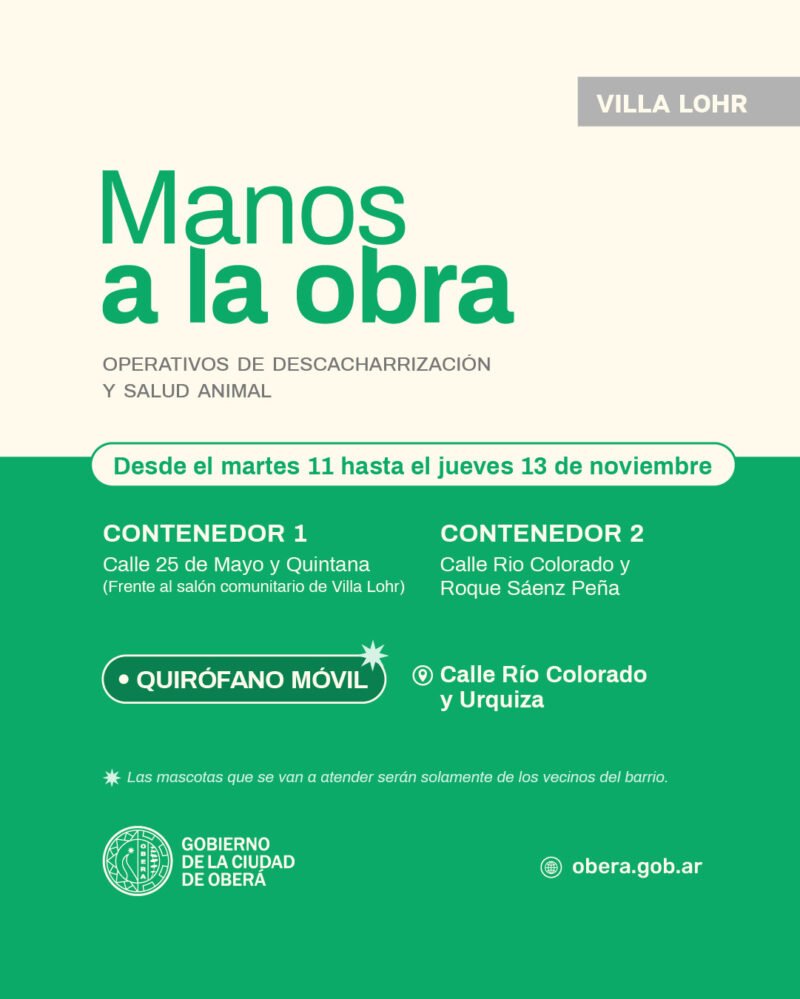 Desde el martes 11 al jueves 13, el Gobierno de la Ciudad de Oberá llevará adelante un nuevo operativo integral en Barrio Villa Lohr.