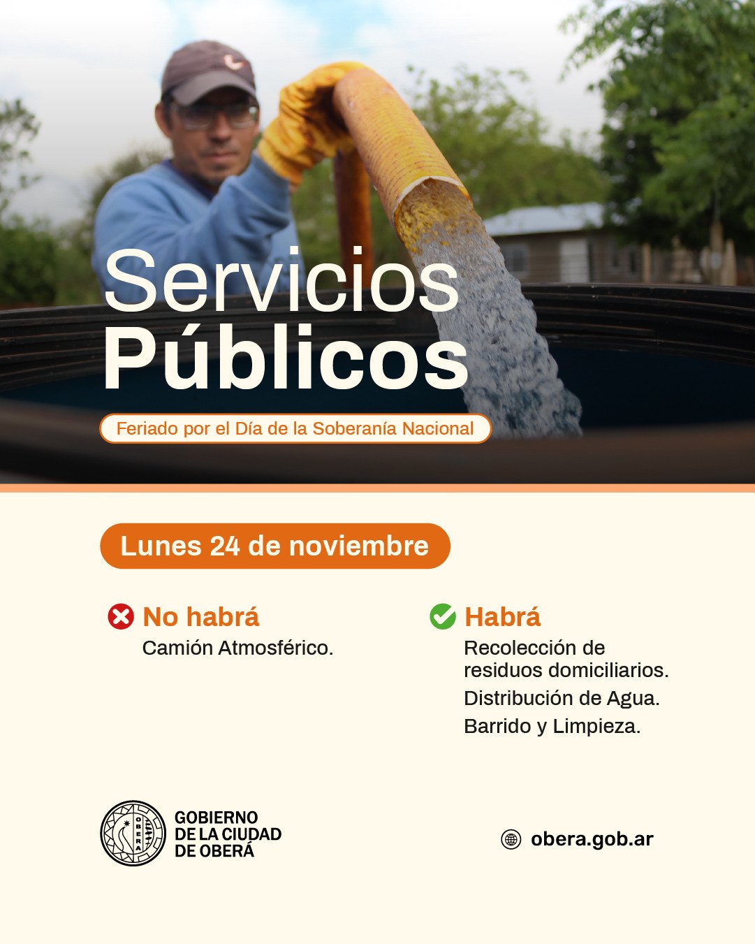 El próximo viernes 21 es día no laborable y el lunes 24 de noviembre es feriado por el Día de la Soberanía Nacional. El Gobierno de la Ciudad de Oberá informa de los servicios que estarán vigentes y los que no se realizará.