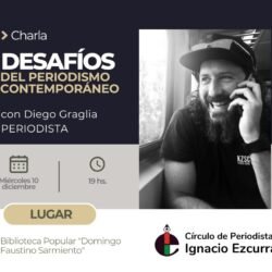 El periodista Diego Graglia, con una extensa trayectoria en medios nacionales e internacionales, brindará una charla titulada “Desafíos del periodismo contemporáneo” el miércoles 10 de diciembre, a las 19, en la Biblioteca Popular “Domingo Faustino Sarmiento”. La actividad es organizada por el Círculo de Periodistas “Ignacio Ezcurra”.