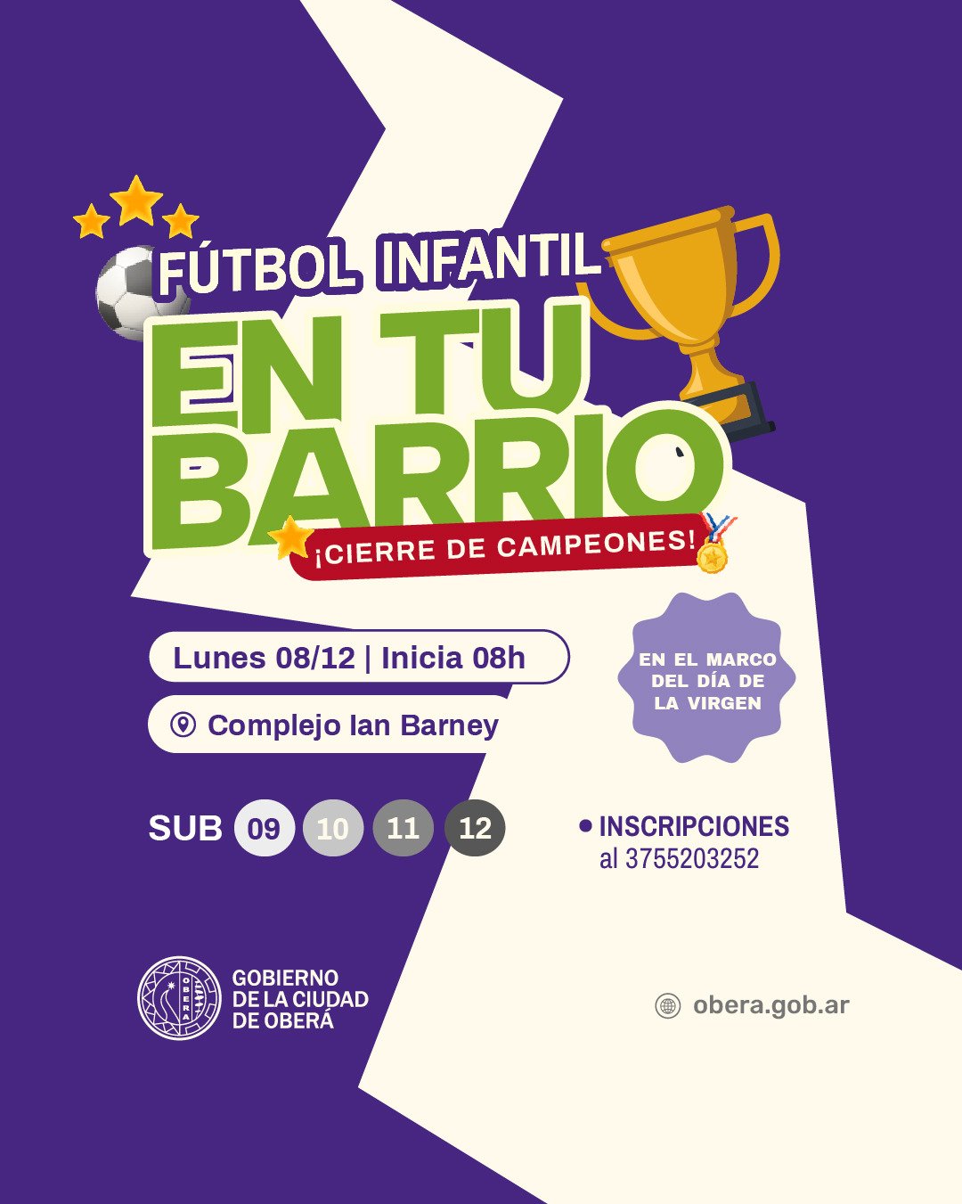 El fútbol infantil barrial culminará su año con un encuentro y Cierre de Campeones el lunes 8, en el marco del Día de la Virgen, en las instalaciones del Complejo Ian Barney. Durante el año se realizaron múltiples fechas en los barrios, y en esta oportunidad los equipos ganadores de cada categoría recibirán sus trofeos.