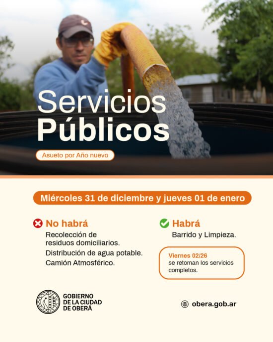 El Gobierno de la Ciudad de Oberá, recomienda tomar los recaudos correspondientes, teniendo presente que los servicios completos se retoman el viernes 2 de enero.