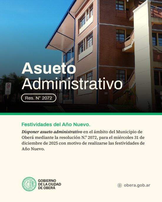 El Gobierno de la Ciudad de Oberá informa que, mediante la Resolución N.º 2072, se dispone asueto administrativo en el ámbito del Municipio de Oberá el miércoles 31 de diciembre de 2025.