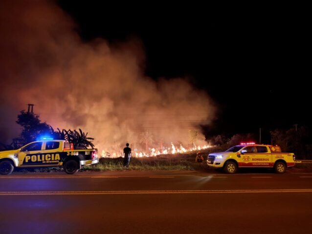 Un incendio de malezas registrado en inmediaciones de la Ruta Nacional 14, frente al acceso a la localidad de Guaraní, demandó durante la noche un amplio despliegue de Bomberos Voluntarios y fuerzas de seguridad para contener las llamas y evitar riesgos para quienes circulaban por la zona.