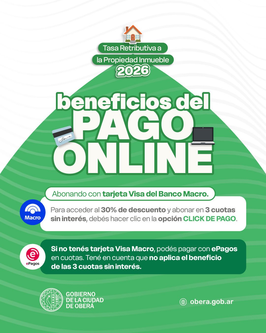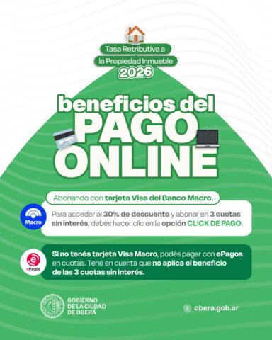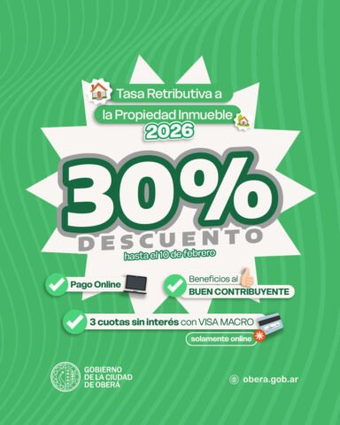El Gobierno de la Ciudad de Oberá informa que se encuentra disponible la Tasa Retributiva a la Propiedad Inmueble correspondiente al período 2026, la cual puede abonarse de manera virtual a través del Portal Tributario, una opción más ágil, cómoda y con mayores beneficios para los contribuyentes.