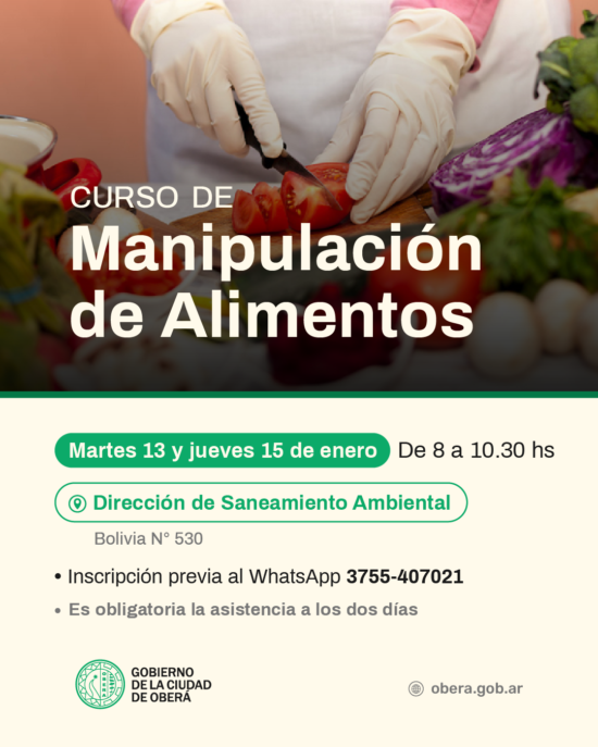 Desde el Gobierno de la Ciudad de Oberá, invitan a la comunidad en general, a participar del taller de Manipulación Segura de alimentos que se brindará el martes 13 y jueves 15 de enero en el horario de 8 a 10:30 horas en la Dirección de Saneamiento Ambiental, sobre calle Bolivia 530.