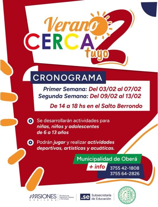 El Estado provincial, junto a los municipios, impulsa el programa Verano Cerca Tuyo II 2026, una propuesta educativa, cultural y recreativa. En Oberá se desarrollará del 2 al 13 de febrero.