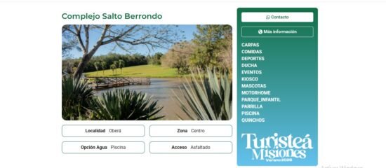 Dentro de esta plataforma, el Complejo Turístico Salto Berrondo se destaca como la joya natural de la Zona Centro. Los interesados pueden consultar todos los detalles del predio directamente a través del enlace oficial: https://viajapormisiones.com/camping/complejo-salto-berrondo/.