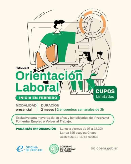 El Gobierno de la Ciudad de Oberá, a través de la Oficina de empleo invitan al Taller de Orientación Laboral que se dictará el mes de febrero y es exclusivo para mayores de 18 años y beneficiarios del Programa Fomentar empleo y VAT (Volver al Trabajo).