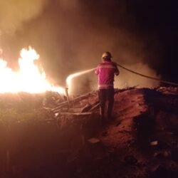 Anoche, la División Bomberos Panambí intervino ante un incendio de residuos de pino y aserrín de grandes dimensiones en el Paraje La Línea, en jurisdicción de Los Helechos.
