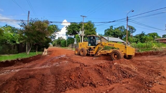 En cuanto a caminos terrados, se avanza en la etapa final de los trabajos con material ecológico. También se realizan mejoras en calles del barrio Villa Industrial, específicamente en las zonas de Sendero de la Mujer y Sapucay, con tareas de perfilado y limpieza de cunetas.