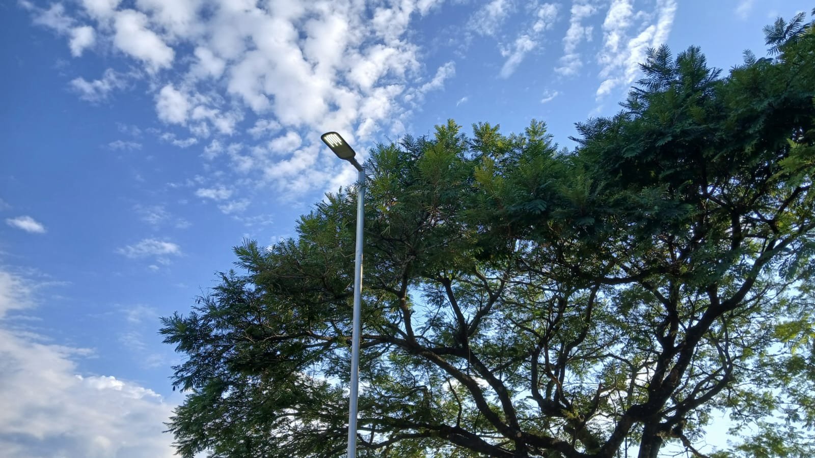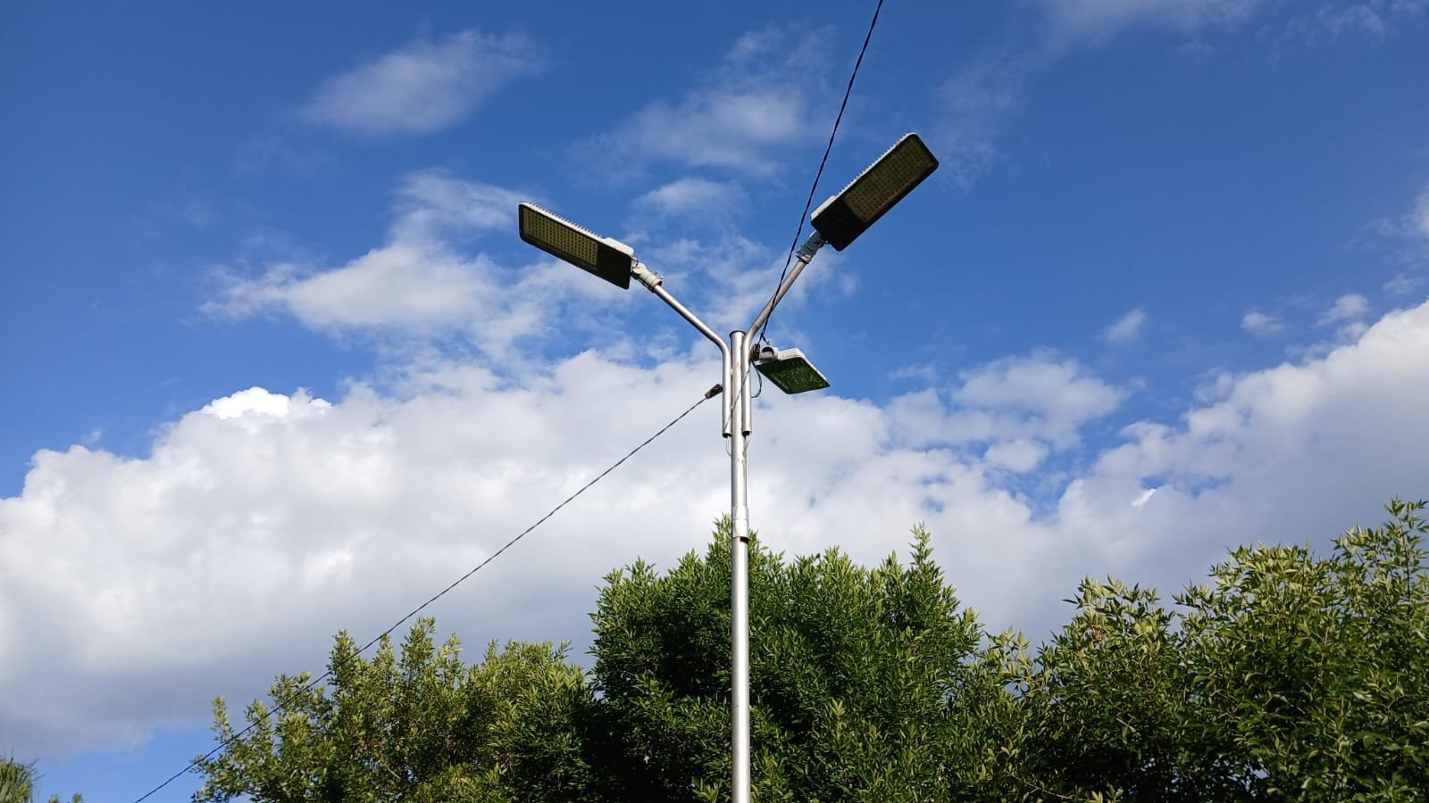 En la plaza Malvinas, personal del Departamento de Construcción trabaja en el recambio y reparación de luminarias, mejorando la iluminación del espacio público.