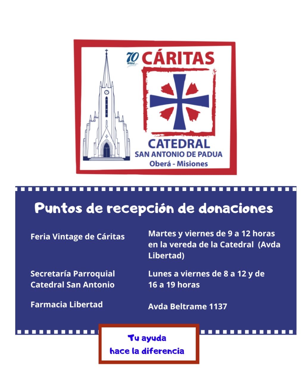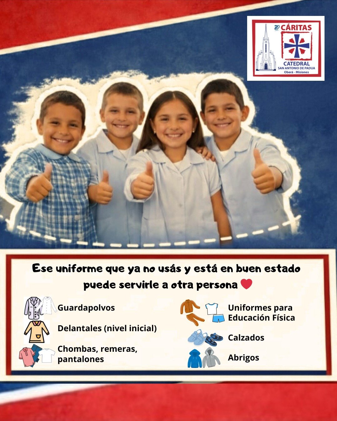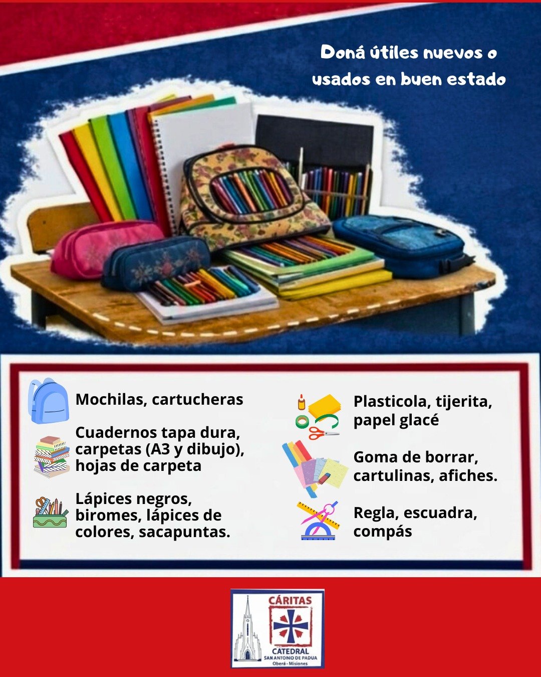 Cáritas San Antonio de Padua impulsa una colecta de útiles, mochilas y uniformes escolares para que niños y niñas de la ciudad puedan comenzar el ciclo lectivo con lo necesario. Las donaciones se reciben en distintos puntos de Oberá.