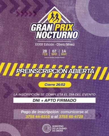 La ciudad de Oberá se prepara para recibir la XXXIII edición del Gran Prix Nocturno, una de las pruebas atléticas más convocantes y esperadas del calendario deportivo local. La competencia se desarrollará en tres fechas: 28 de febrero, 7 y 14 de marzo, convocando a atletas de distintas categorías.