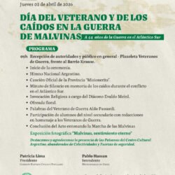 Se realizará el acto oficial en conmemoración del Día del Veterano y de los Caídos en la Guerra de Malvinas el próximo jueves 2 de abril de 2026, al cumplirse 44 años del conflicto en el Atlántico Sur.